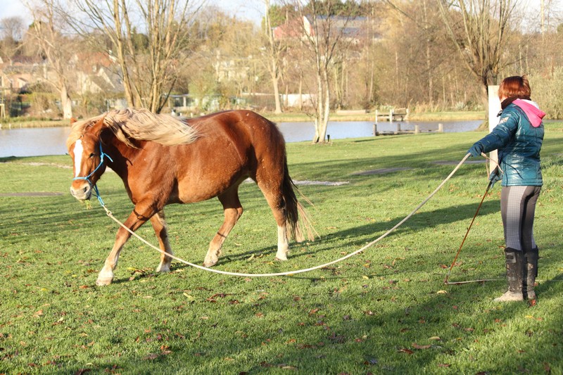 Pour le ramené au trot, l'apprentissge s'est fait quand je recule en courant et basculant le buste, maintenant le but c'est rien qu'en basculant le buste, elle revienne au trot. Donc progression suivante ici : basculer le buste et monter l'énergie, caresser la corde, reculer seulement.